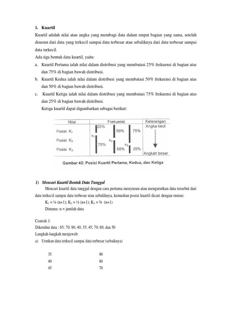 Nilai pada pelajaran statistik i terdapat sebanyak 10 mahasiswa, dengan nilai : Untuk menentukan persentil untuk data belum atau tak berkelompok yaitu dengan cara mencari jadi, desil ke 6 dari data tersebut adalah 21,9. Dalam mencari nilai desil pada data tunggal, dapat dilihat pada penjelasan dibawah ini : 6 nilai kuartil untuk data tunggal seperti yang telah disebutkan sebelumnya, kuartil membagi data menjadi empat bagian sama banyak. Cari d1, d3, d5, dan d9 dari data berikut. 4 nilai desil untuk data kelompok cara mencari nilai desil pada data kelompok dapat menggunakan rumus desil untuk data kelompok yang diberikan di bawah. Desil sendiri terbagi menjadi 9 macam yaitu dibawah ini adalah rumus mencari desil untuk data tunggal. Mempelajari tentang materi statistika, desil, dan persentil data tunggal dan data berkelompok matematika untuk smk semester. Dengan i = 1, 2, 3,., 9 dan n adalah cacah data. Desil untuk data bergolong ( berkelompok) keterangan : Dalam mencari nilai desil pada data tunggal, dapat dilihat pada penjelasan dibawah ini : Dikarenakan desil ini membagikan data hingga menjadi 10 bagian, maka hal ini akan digunakan sebagai dasar penghitungan desil jika menggunakan untuk lebih jelasnya kami juga menyediakan contoh soal untuk mencari nilai desil, mulai dari desil data tunggal hingga desil data kelompok. Menentukan desil data tak berkelompok.