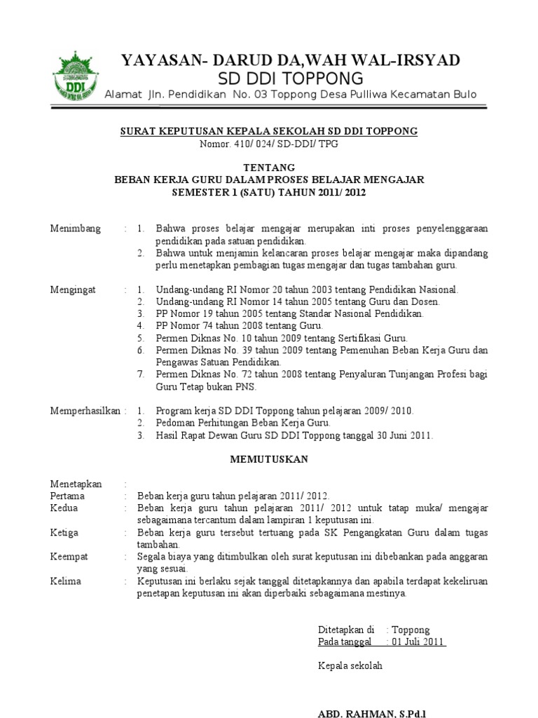 Menjelang tahun pelajaran baru 2021/2022 yang semakin dekat. Surat keputusan (sk) pembagian tugas mengajar merupakan salah satu bagian administrasi guru yang penting, karena di gubakan sebagai bukti fisik jika ada monev. Text of contoh sk mengajar guru. Atau bimbingan konseling, tugas tambahan dan tugas lain. .mengajar guru tk/paud, sd/mi, smp serta sma untuk tahun pelajaran 2017/2018, sekarang sudah menginjak tahun ajaran baru segala sesuatu keperluan administrasi guru perlu untuk disiapkan guna untukkeperluan proses belajar mengajar, yang paling penting salah satunya adalah sk.
