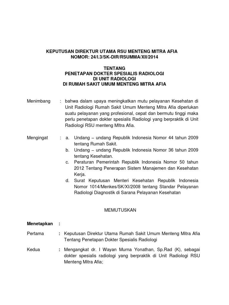 Pengangkatan kepala staf keperawatan fungsional pada rsud dr. Pengangkatan, persyaratan, dan prosedur perekrutan direktur 1. Peraturan menteri kesehatan no 9 tahun 2014 tentang klinik. A 2 sekretaris komite medis dr. Bahwa untuk memenuhi kebutuhan tersebut rumah sakit dapat perlu menetapkan seorang individu untuk mengelola lingkungan rumah sakit dengan meminimalkan risiko terhadap pasien, staf, keluarga dan pengunjung sebagai seorang manajer risiko; 10 contoh surat keputusan pengangkatan karyawan dll lengkap. Bahwa dalam kegiatan penyelenggaraan pelayanan kesehatan di rumah sakit harus dilakukan pengawasan secara internal untuk. Dewa putu gde purwa samatra, sp.s (k) berdasarkan sk rektor no. /sk/rsgm/iii/2016 tentang pengangkatan kepala anestesiologi dan terapi intensif rumah sakit grand medistra Scribd es red social de lectura y publicación mÔs importante del mundo. Keputusan direktur utama rs grand medistra no: Pengelola rumah sakit adalah direktur rumah sakit yang diangkat oleh pt. 37 full pdfs related to this paper.